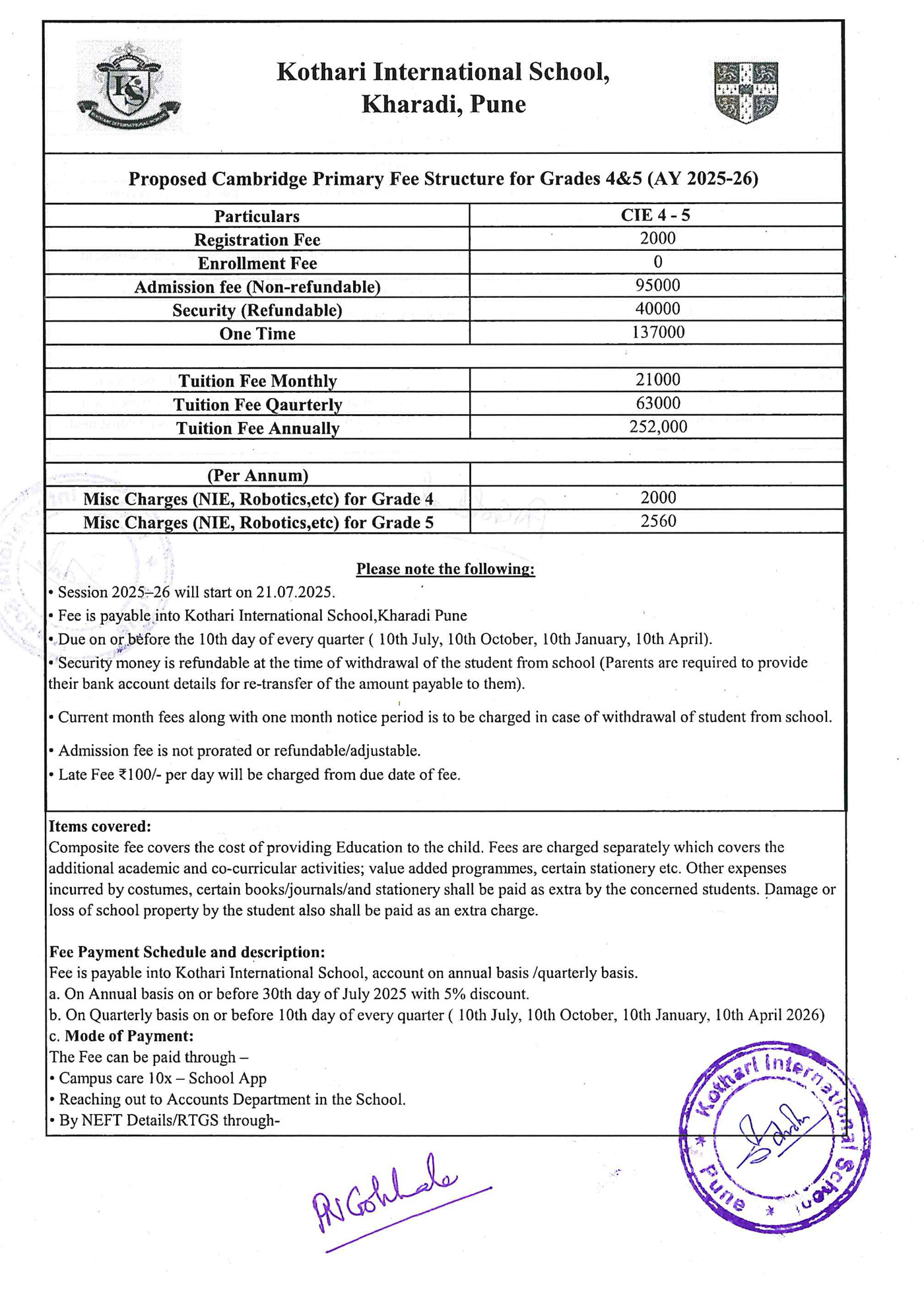 Fee is payable into Kothari International School, account on annual basis /quarterly basis / monthly basis